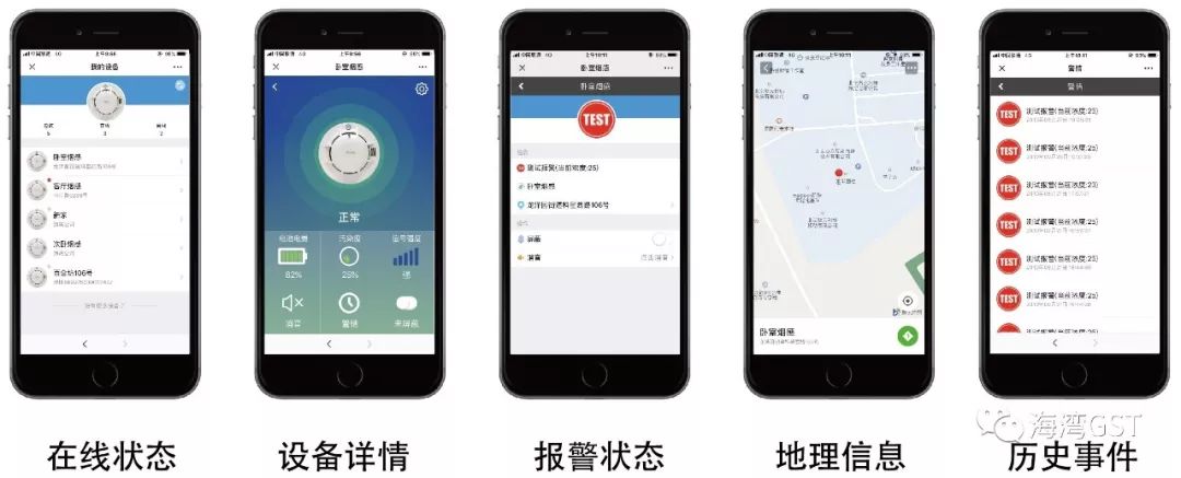手機應用端,可在線監測報警器的在線離線狀態、電池電量、污染程度及NB-IoT網絡信號強度,及時發現故障 ,全面掌控設備工作狀態。