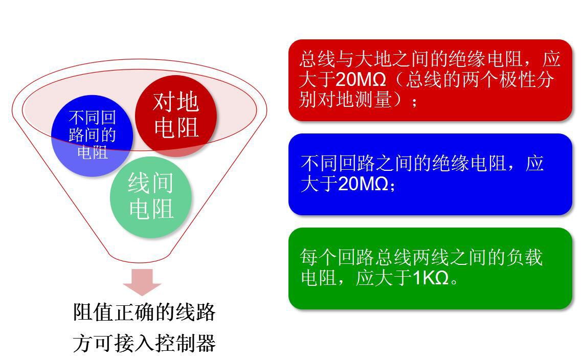 火災自動報警系統導線敷設后,在安裝現場設備之前,應對每回路的導線用500V的兆歐表(搖表)測量絕緣電阻,其對地絕緣電阻值不應小于20MΩ。接好設備后,用萬用表的歐姆檔檢查線間是否短路,阻值是否正常(大于1KΩ),線路是否接地(大于20MΩ)。有以上故障應及時處理。