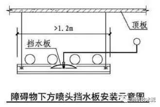 2 寬度大于本規范第7.2.3條規定的障礙物( 當梁、通風管道、成排布置的管道、橋架等障礙物的寬度大于1.2m時;采用早期抑制快速響應噴頭和特殊應用噴頭的場所,當障礙物寬度大于0.6m時。),增設的灑水噴頭上方有孔洞、縫隙時,可在灑水噴頭的上方設置擋水板。