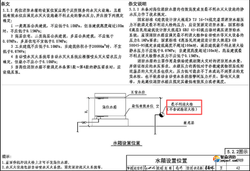 5.2.2 高位消防水箱的設置位置應高于其所服務的水滅火設施,且最低有效水位應滿足水滅火設施最不利點處的靜水壓力,并應按下列規定確定: